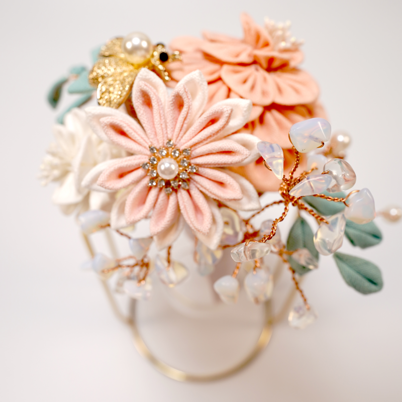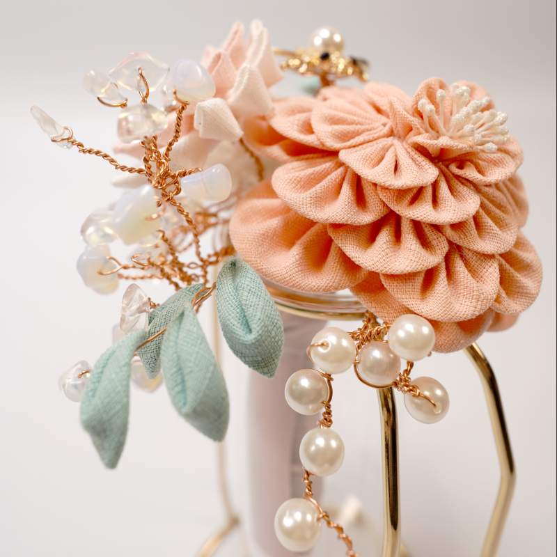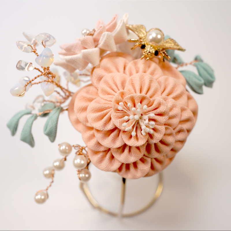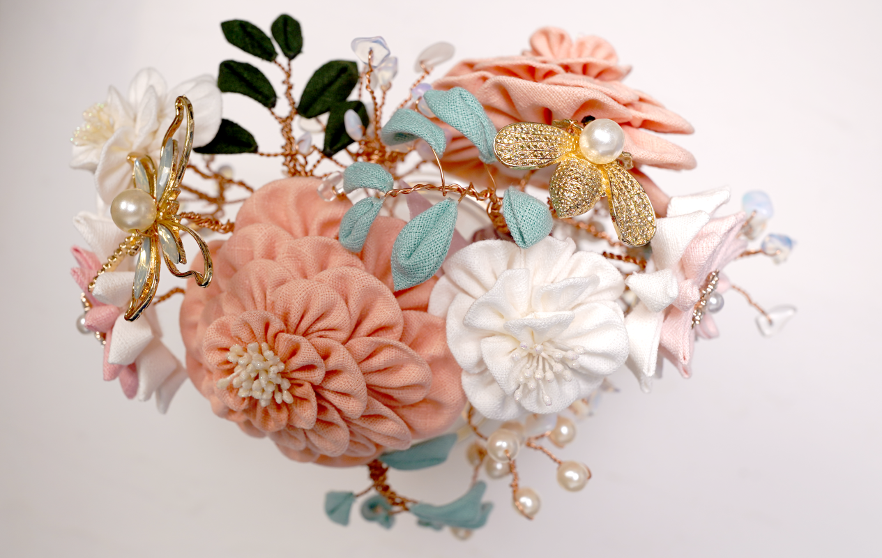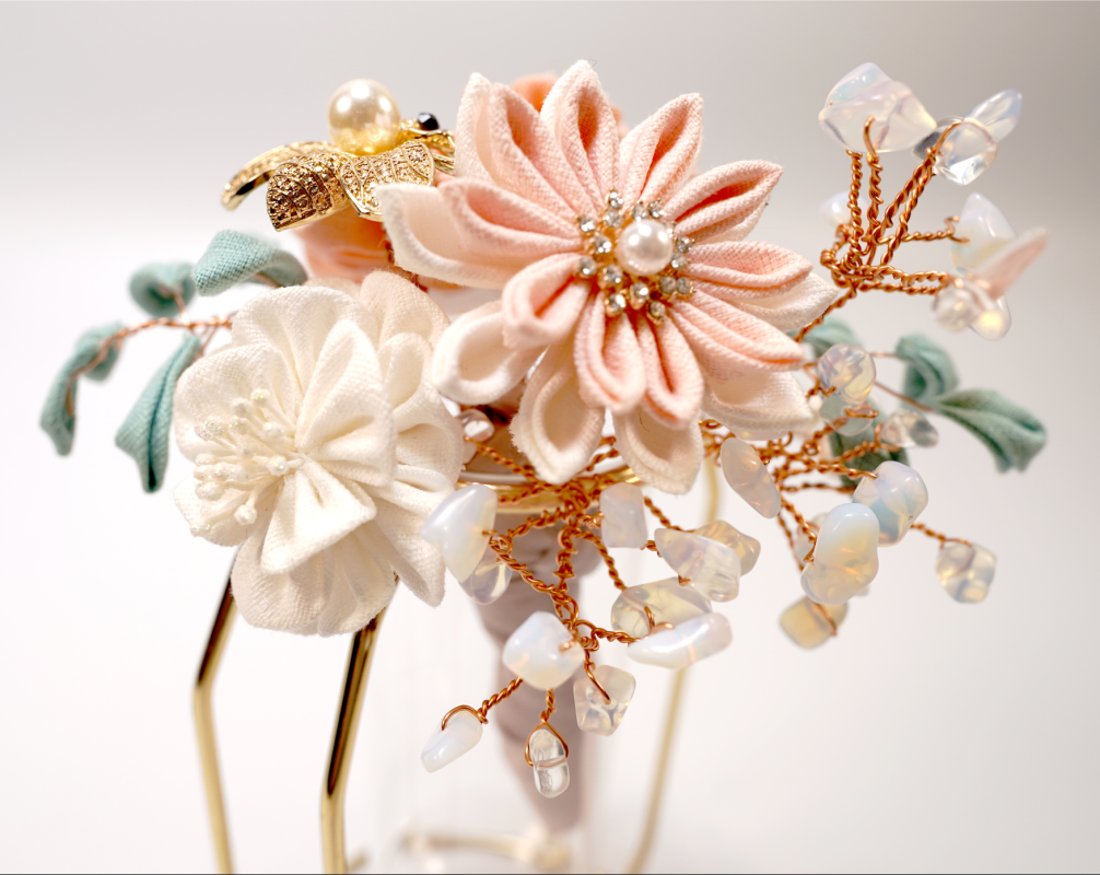 撮細工,TSUMAMI,日語稱作「つまみ細工」,是一門源自日本江戶時期的傳統手工藝術,以其獨特的技法和精緻美觀著稱,被東京都認定為傳統工藝。這種藝術形式的核心在於將小塊布料巧妙地摺疊成各種自然界的元素,如植物和動物等模樣,最終製成各式裝飾品,尤其是髮飾,為日常裝扮增添一抹優雅。撮細工的歷史可追溯至江戶時代初期,當時江戶(今東京)從京都引入了製作花簪的技藝並將之發揚光大。這門藝術最初是通過將方形布片巧摺成各種形狀,再組合拼貼成花鳥等自然景觀的形象。到了江戶時代中期,撮細工的應用變得更加廣泛,從櫛、簪到楠玉(一種香氛裝飾)的製作無所不包,以其美觀和經濟性贏得了廣泛的人氣。這種由簡單布片轉化為精美藝術品的過程,不僅體現了日本工藝的細膩與精緻,也是日本文化獨有的藝術表現形式之一。